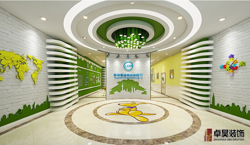 本案長沙工裝公司湖南卓昊裝飾集團為愛迪幼兒園裝修設計項目面積大約1400平米,曲線的動感結合顏色的漸變,可以達到視覺緩沖的目的,使空間層次更為豐富,視線隨海浪而動,極富韻律感。 墻面、地面均融合閩江風景元素,展現(xiàn)園所獨特的文化氛圍。同時,線條與色彩的自由伸展,給予幼兒藝術審美細胞孕育發(fā)展的無限可能。與二層曲線柔和、寧靜的思路不同,一層大廳的設計顯得更加天馬行空。立柱旨在“孩子們的人生從這里起航” 同時,它又是一個大號兒玩具,讓孩子們一進門就移不開目光。 頂部鏡面設計給大廳增添了許多魔幻色彩,如水面一般的倒影,卻在天空上呈現(xiàn),能充分激發(fā)孩子們的好奇心和想象力。