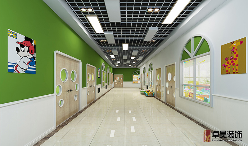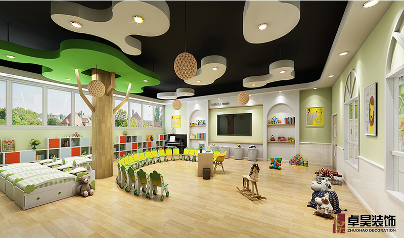 本案長沙工裝公司湖南卓昊裝飾集團為愛迪幼兒園裝修設計項目面積大約1400平米,曲線的動感結合顏色的漸變,可以達到視覺緩沖的目的,使空間層次更為豐富,視線隨海浪而動,極富韻律感。墻面、地面均融合閩江風景元素,展現(xiàn)