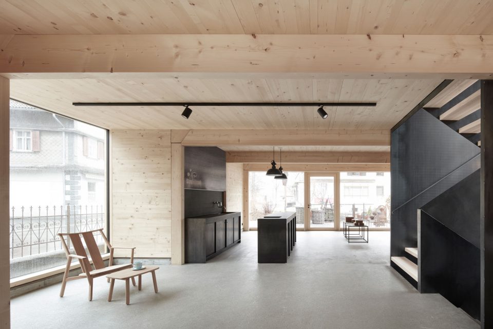 室內(nèi)的特點(diǎn)是采用了大量的原木材料,并且保留了建筑內(nèi)部的純粹的結(jié)構(gòu)性設(shè)計(jì)。裸露的實(shí)木用簡(jiǎn)單、精確的細(xì)節(jié)展示了工匠的技術(shù)。空間中的燈具和中央樓梯都采用了黑色的鋼結(jié)構(gòu)設(shè)計(jì)突出了空間中展示的商品。內(nèi)墻使用了云山木板飾面,冷杉木材料作為支撐結(jié)構(gòu)。一層采用剖光的水泥地板,二層則使用了白蠟?zāi)句伱妫匕逯羞€集成了一體化的地?zé)嵯到y(tǒng)。相對(duì)于原先的工作坊來說,改造后的建筑為整個(gè)空間提供了簡(jiǎn)單而純粹的感官體驗(yàn)。