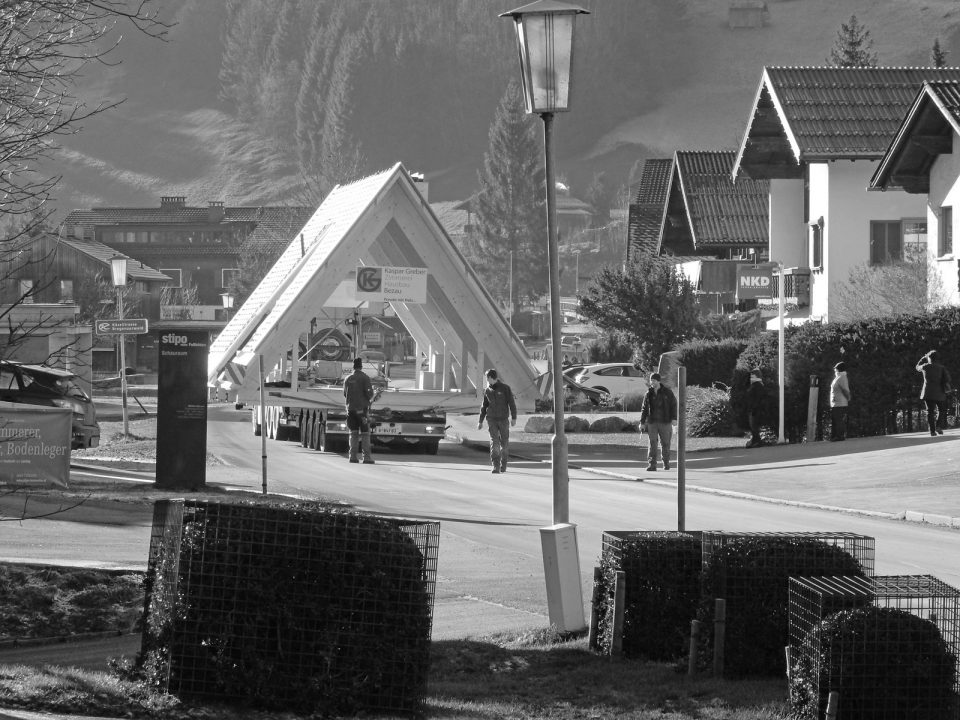 建筑的支撐結(jié)構(gòu)也體現(xiàn)了相同的概念,預(yù)制的木結(jié)構(gòu)框架使用了實(shí)木材料,連接處完全沒有使用任何金屬固定。外墻和建筑物的梁柱體系也由實(shí)木材料組成。為了盡量避免中斷商店的營(yíng)業(yè)過程,整個(gè)結(jié)構(gòu)在場(chǎng)地附近的木材建筑公司預(yù)先組裝完成,再于現(xiàn)場(chǎng)安裝。高度預(yù)制化的設(shè)計(jì)使得建筑可以在最快的時(shí)間內(nèi)有著最高的完成質(zhì)量。由于場(chǎng)地離木材建筑公司非常近,所以整個(gè)屋頂都是組裝好以后,用起重機(jī)安裝在基座上的。