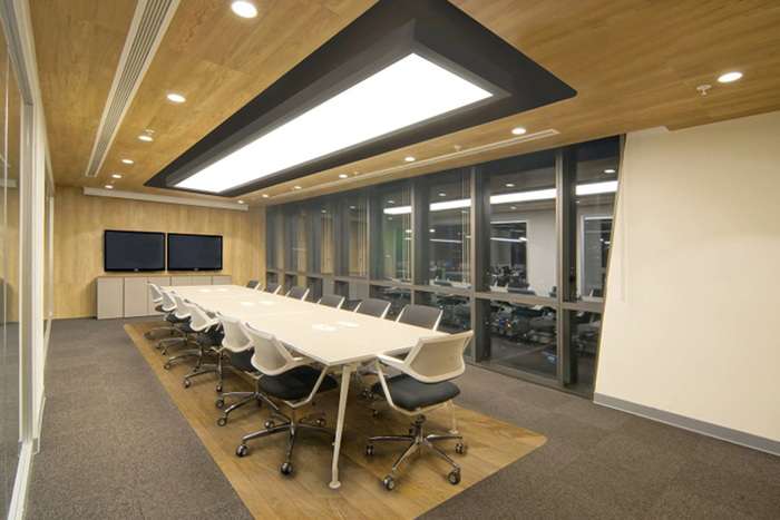 群體會(huì)議室要考慮以下兩點(diǎn):使用漫射照明柔化人的表情,營(yíng)造較為舒適的氛圍;而會(huì)議往往需要進(jìn)行閱讀和記錄的工作,因此會(huì)議室的光線照射應(yīng)該集中在桌面上。