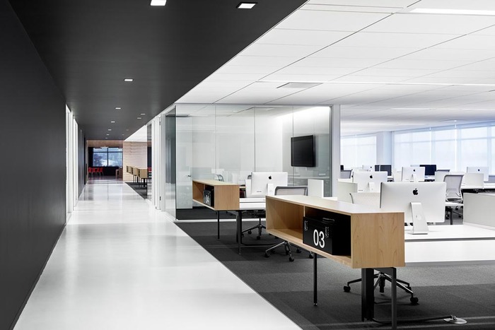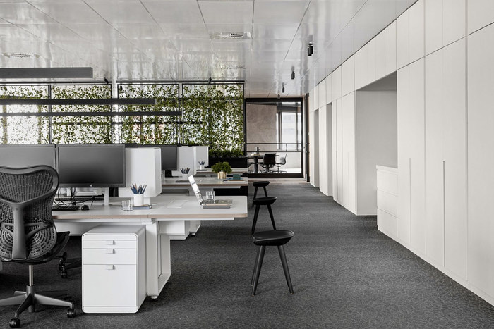 室內(nèi)界面通常是由六個(gè)界面構(gòu)成,其中比較主要的是地面、墻面和頂面三個(gè)。為了取得比較好的辦公空間效果,需將墻面的空間形狀、色彩及質(zhì)感等方面進(jìn)行處理,橫向的線條或紋理在空間內(nèi)呈水平延伸,可使人感到安定,而縱向的線條或紋理則能使空間更顯高聳,易給人以興奮感,因此,低矮的辦公空間可選用縱向紋理來增加空間的視覺高度,窄小的空間可選用橫向線條來進(jìn)行裝飾。同時(shí)在進(jìn)行界面處理的時(shí)候還需要注意背景陪襯、風(fēng)格氣氛的協(xié)調(diào),常用處理手法包括形體與過渡、質(zhì)感與光感的調(diào)整等。