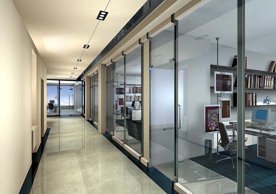 辦公室走廊起到鏈接各個辦公區(qū)的作用,又是對人起到引導(dǎo)路線的作用,那么可以說其走道的設(shè)計重點(diǎn)之一是地面了,在建筑學(xué)中地面是起引導(dǎo)路線作用的。因?yàn)樽叩烂娣e的限制,我們在設(shè)計中往往把視線重點(diǎn)放在地面上,這時地面裝飾就顯得很重要了!