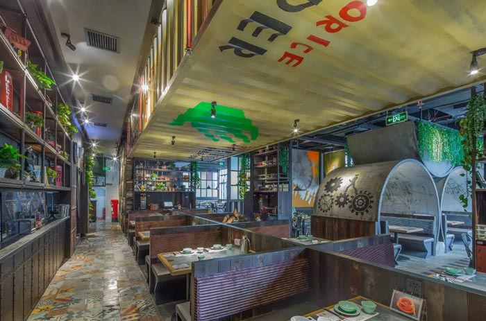 輾轉(zhuǎn)反側(cè)間,時(shí)光機(jī)帶領(lǐng)我們穿越到一片熟悉的場(chǎng)景,載滿(mǎn)思念的郵筒和留聲機(jī),國(guó)內(nèi)八九十年代最常見(jiàn)的集裝箱、下水管道、鋼板以及舊木條等各種復(fù)古元素,在一個(gè)餐飲空間中被運(yùn)用得淋漓盡致。